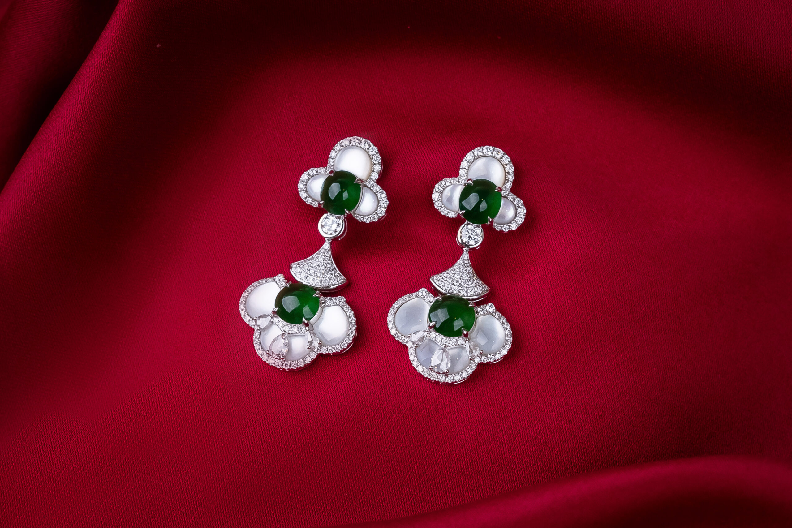 Combination of white and green jade with diamonds making these earrings your go to for special days!